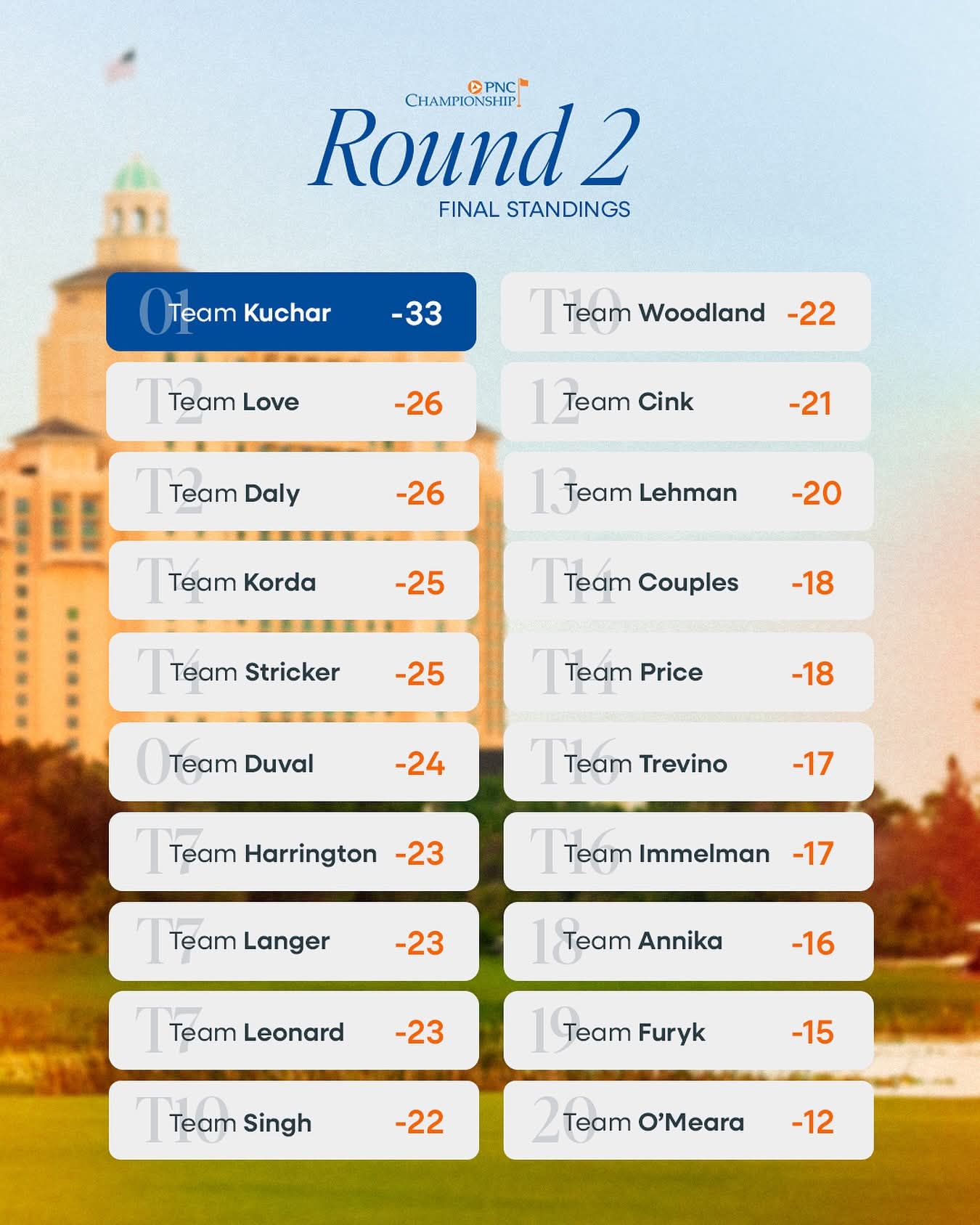 데이비스 러브 3세 부자와 존 댈리 부자는 나란히 최종 합계 26언더파 118타로 공동 준우승을 차지했다. 넬리 코다-페트로 부녀는 최종 합계 25언더파 119타로 스티브 스크리커 부자와 함께 공동 4위에 올랐다.