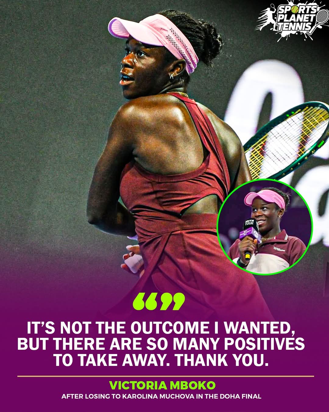 음보코: 음보코는 경기 후 기자회견에서 "결승에 진출하는 것은 일반적으로 긍정적인 일이며, 결코 부정적인 일이 아닙니다."라고 말했습니다. 그녀는 정말 훌륭한 테니스를 쳤습니다. 저도 처음으로 톱 10에 오른 선수들을 플레이해보니 제 자신에 대한 기대가 많지 않았습니다.