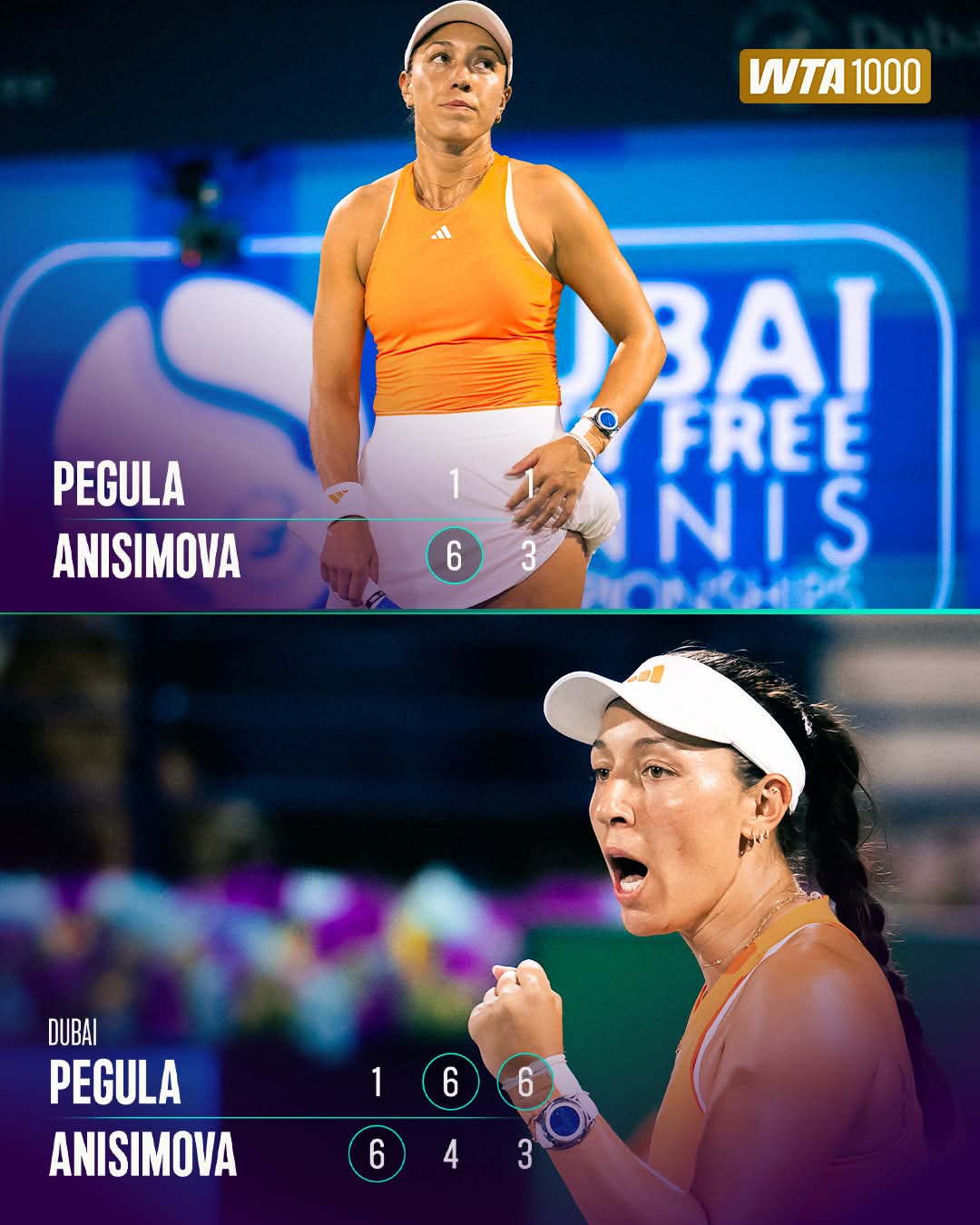 아니시모바는 금요일 페굴라가 역전승을 거두며 두바이 면세점 테니스 선수권 대회에서 타이틀 매치에 진출하기 전까지 추세를 반전시켰습니다. 첫 11경기 중 9경기를 내준 페굴라는 0-40으로 동포 여자를 꺾을 기회를 놓친 후 1-6, 6-4, 6-3으로 승리하며 다시 한 번 승리를 거뒀습니다.