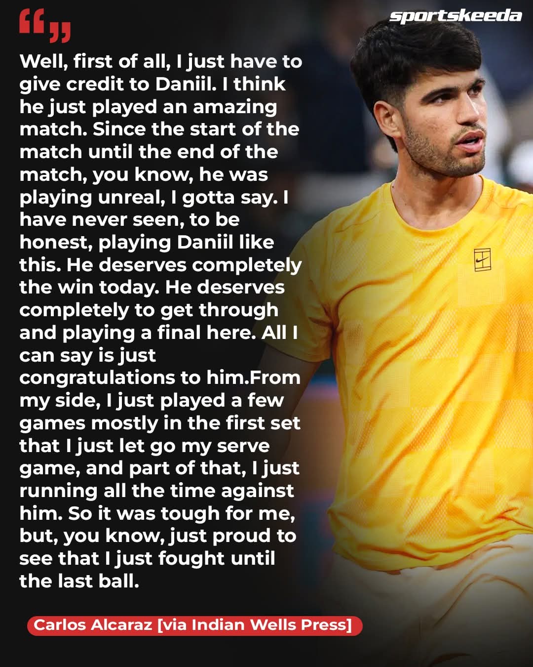 "다니엘에게 공을 돌리고 싶습니다. 그는 방금 멋진 경기를 한 것 같아요."라고 알카라즈는 말했습니다. "경기 시작부터 경기가 끝날 때까지 그는 비현실적인 플레이를 하고 있었습니다. 솔직히 말해서, 다닐이 이렇게 연주하는 것을 본 적이 없습니다.