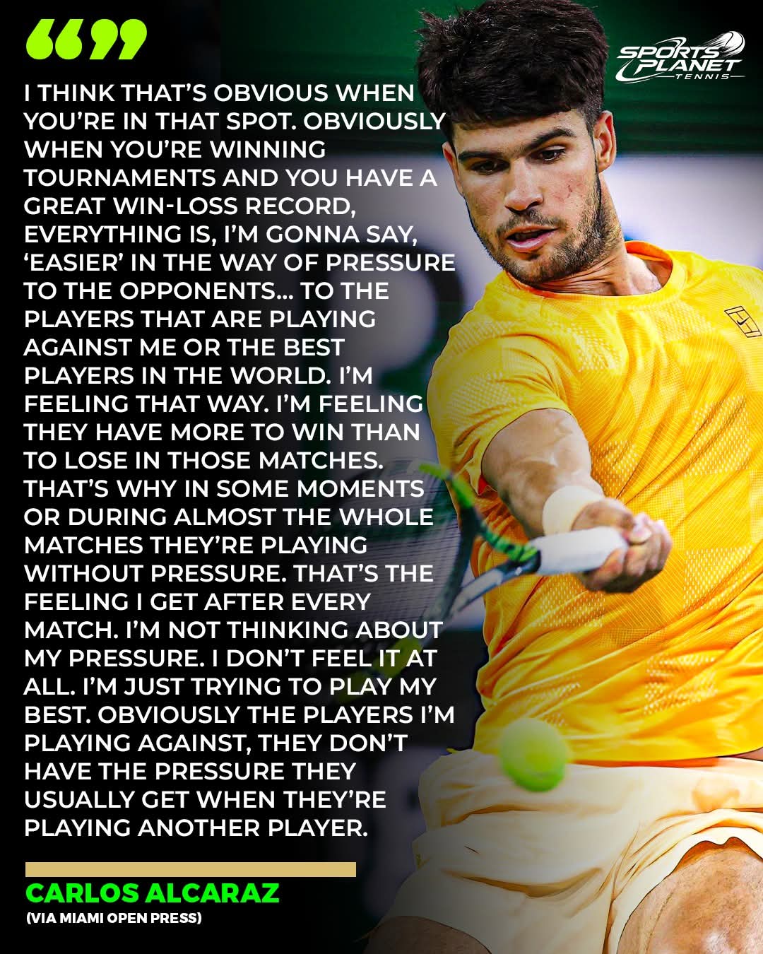 알카라즈는 "분명히 제가 상대하는 선수들은 다른 선수와 경기할 때 일반적으로 받는 (저에 대한) 압박감이 크지 않다고 생각합니다."라고 인정했습니다.