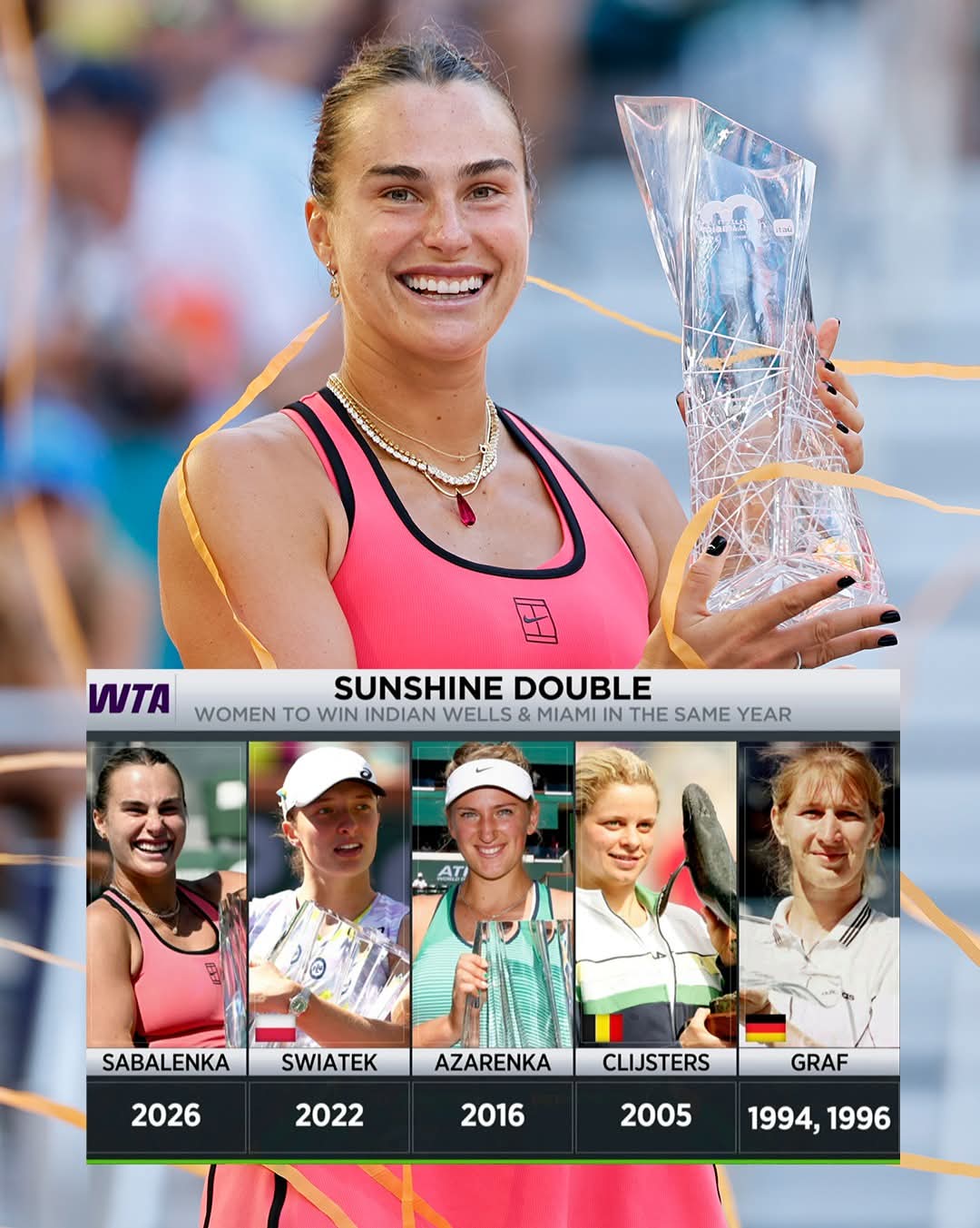 선샤인 더블은 사막 기후 고지대인 파리바오픈과 높은 습도의 평지인 마이애미오픈을 한 해에 모두 제패해야 하는 난도 높은 기록이다. 슈테피 그라프, 킴 클레이스터르스, 빅토리야 아자란카, 이가 시비옹테크에 이어 사발렌카가 역대 다섯 번째 달성자가 됐다.